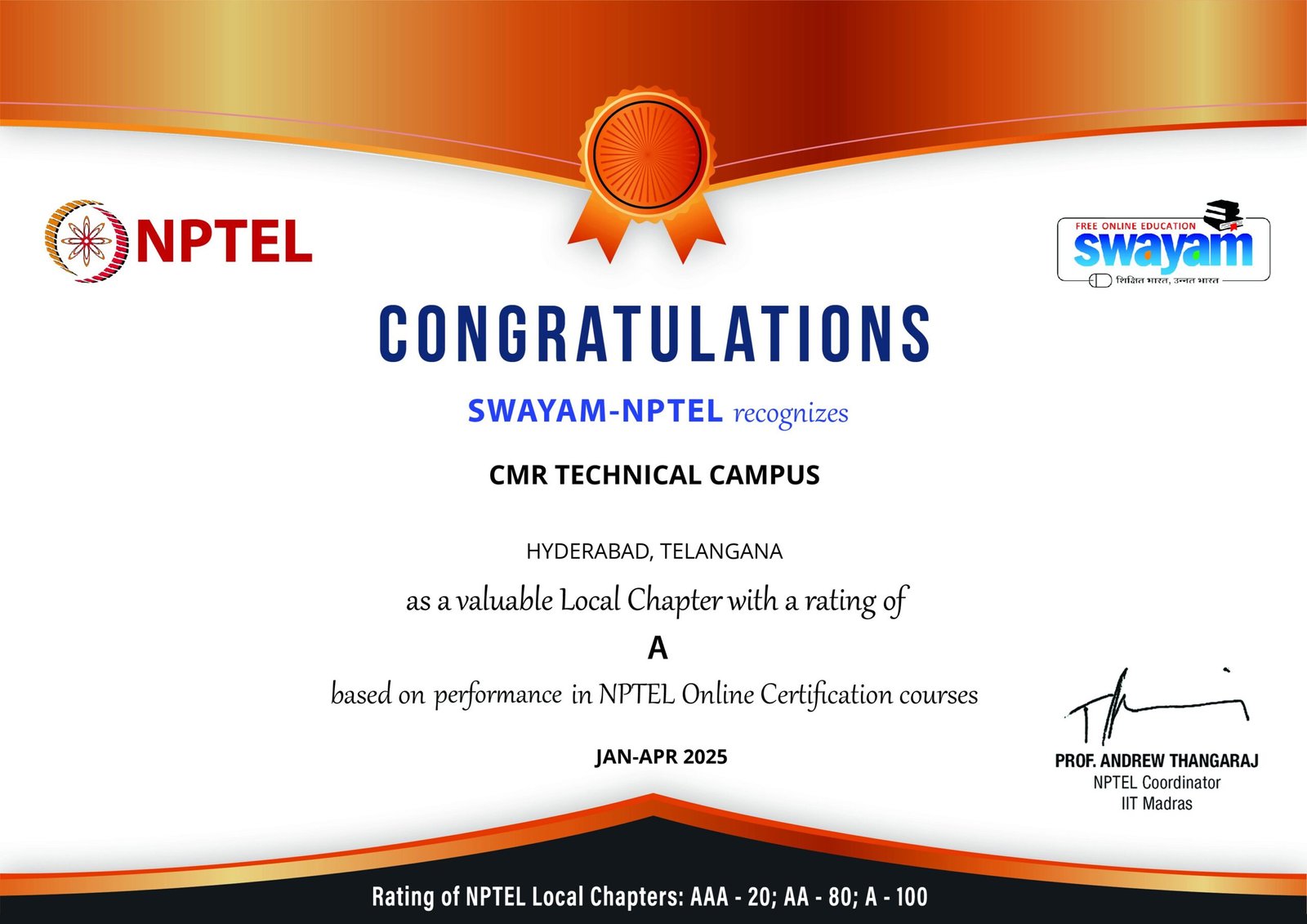 | 2 | NPTEL Top 100 Local Chapter A | Jan – Apr 2025 | View |