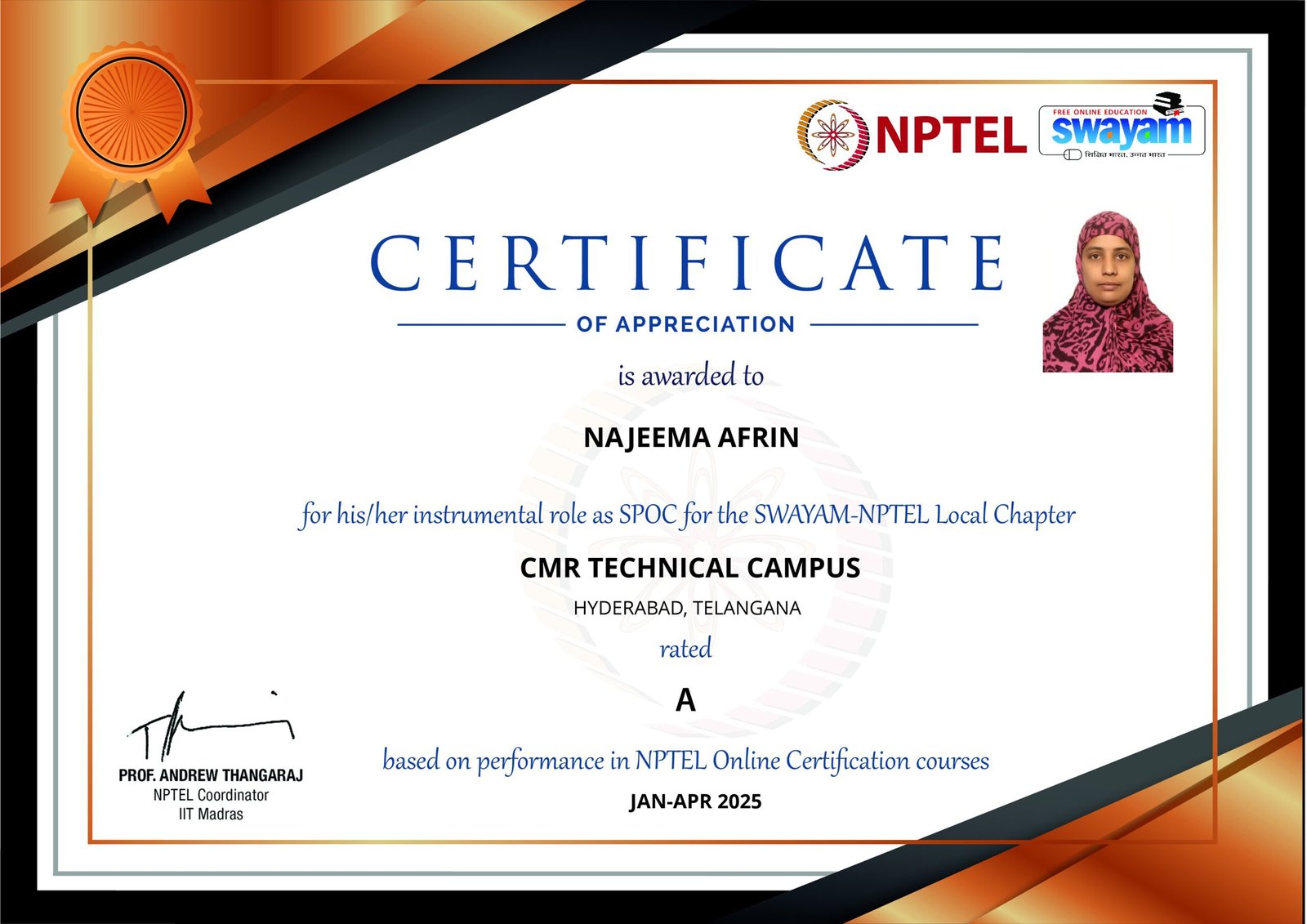 | 10 | NPTELSS1250108023 | Suraya Mubeen | suraya418@gmail.com | NPTEL_DISCIPLINE_STARS | Jan-Apr 2025 |