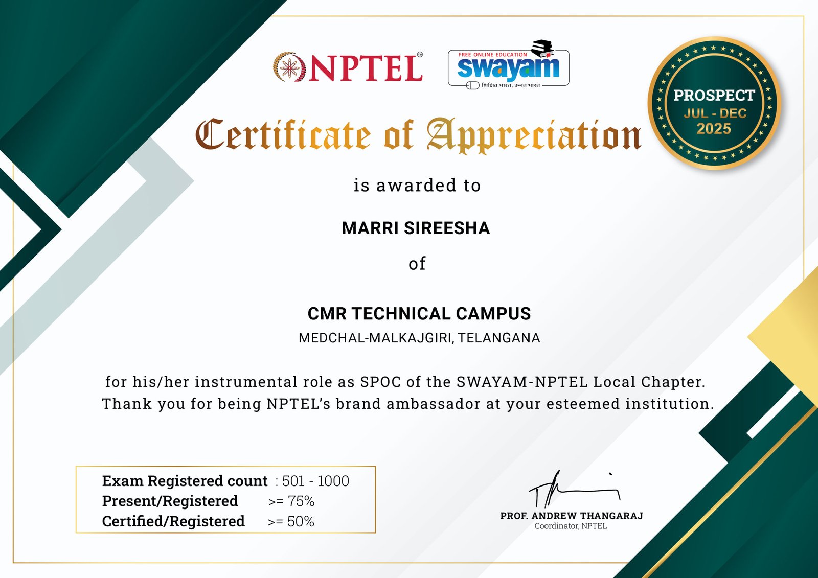 | 3 | NPTELSP2250101206 | DR MAHESH KOTHA | kotha.mahesh528@gmail.com | NPTEL_STAR_PARTICIPANTS | Jul-Dec 2025 |