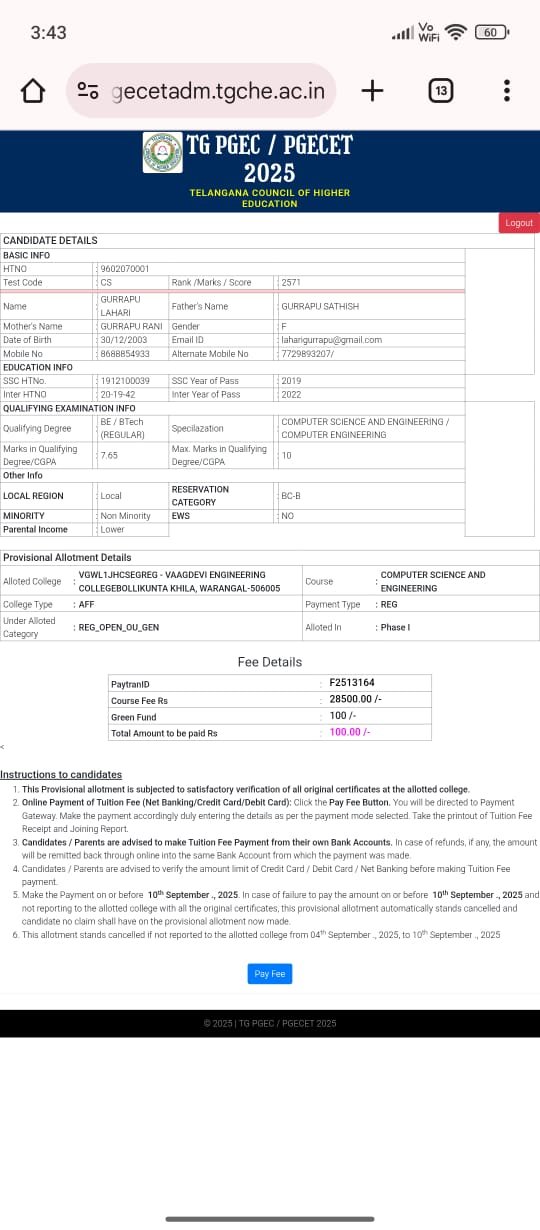 | 34 | 227R5A6615 | GURRAPU LAHARI | M.TECH | VAAGDEVI ENG COLLEGE, WARANGAL | View |