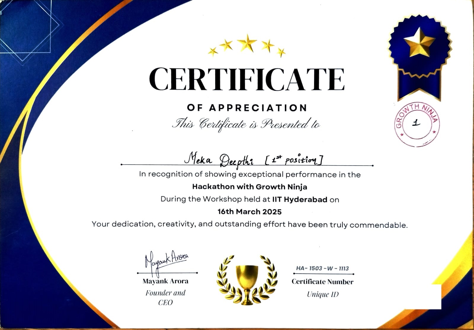 | 2024-25 | 247R1A6695 | Meka Deepthi | Stood First in Hackathon with Growing Ninja at IIT Hyderabad |