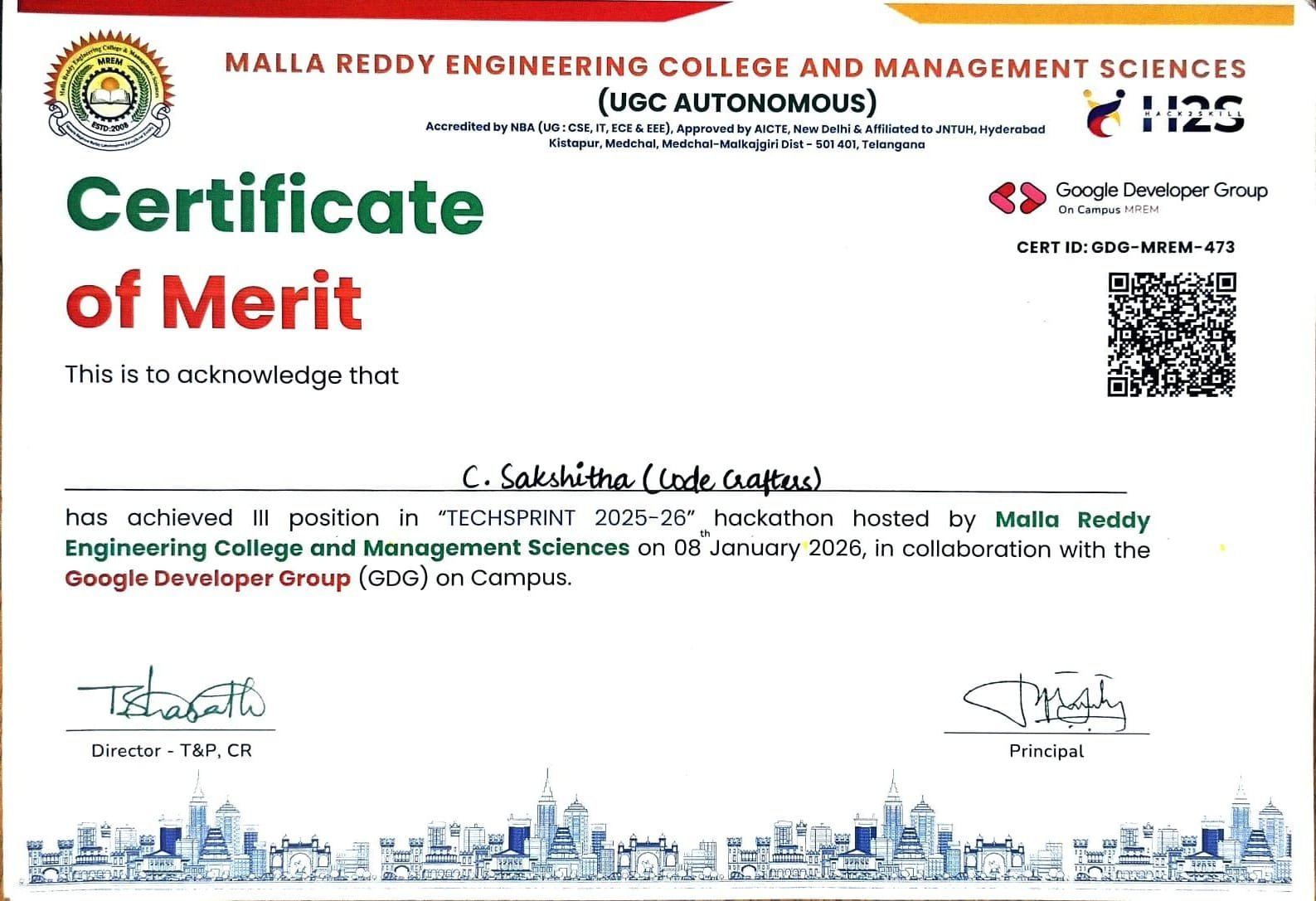Won III Prize in TechSpring 2025-26 hackathon hosted by Mallareddy Engineeirng College and Management Sciences.