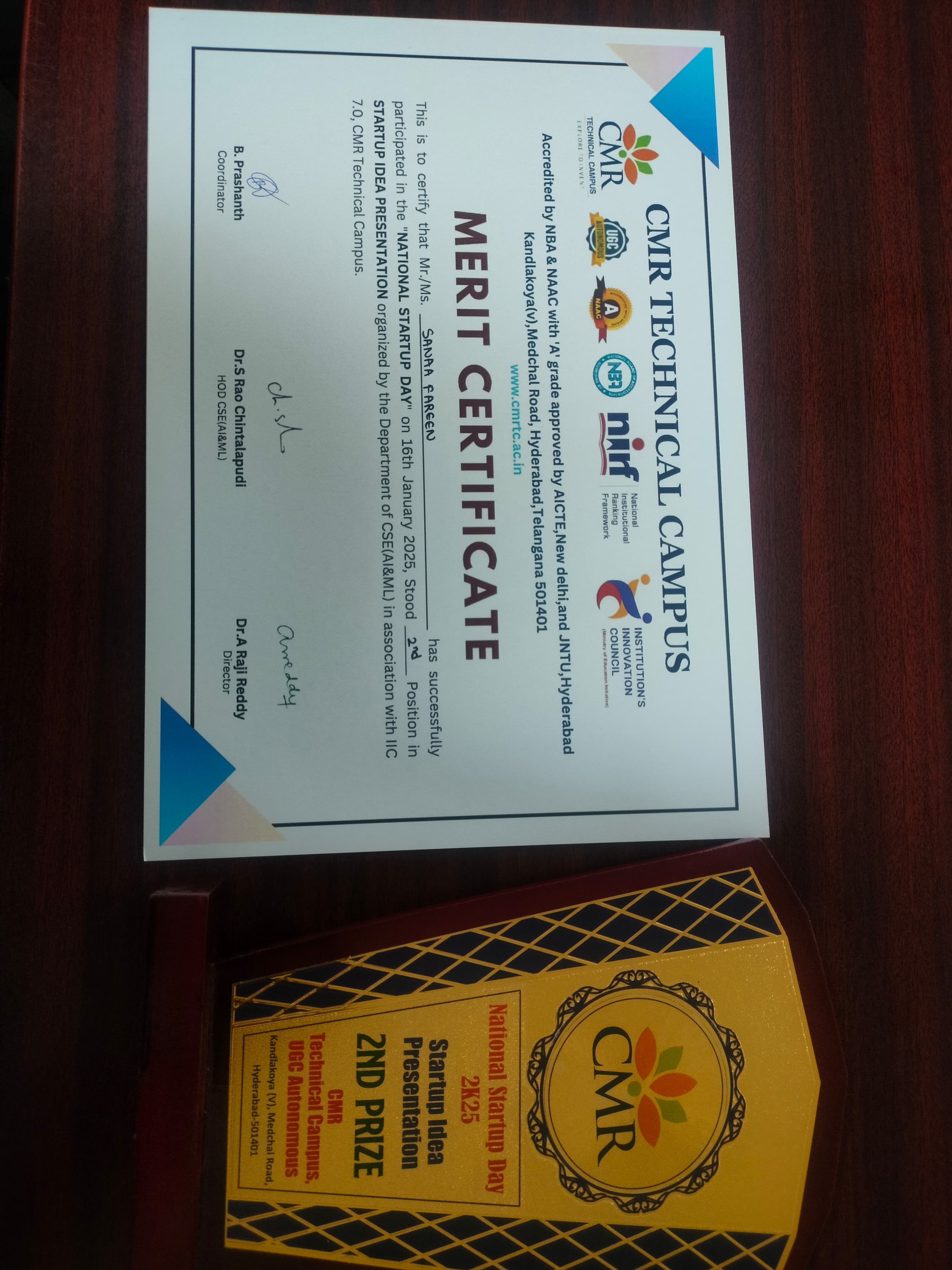 - Technical Presentation first prize award received by III CSE, Mr Gagandeep Bhakshi at JNTUH by CSI 2012-16 Batch.