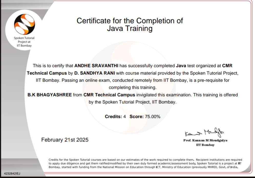 | A Sravanthi | Completion of JAVA Course from IIT Bombay Spoken Tutorials | View | |