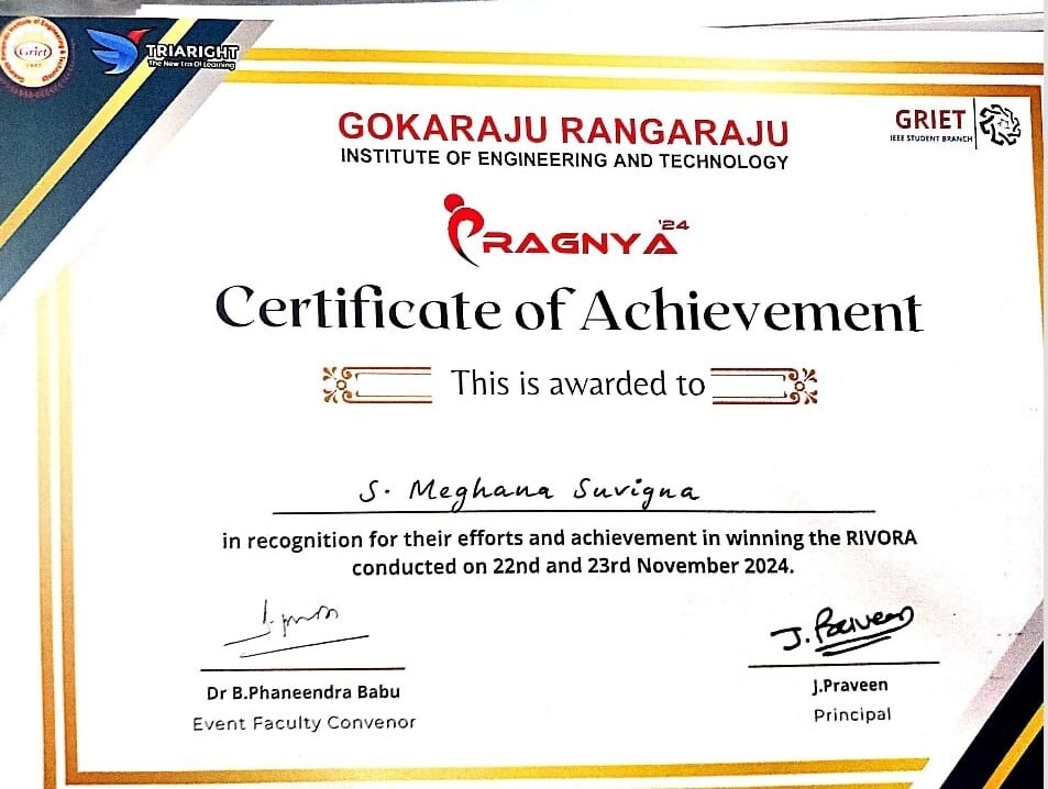 | Sarella Meghana Suvigna & Team | 2022-26 | won the RIVORA Ideathon competition at Gokaraju Rangaraju College of Engineering | View |