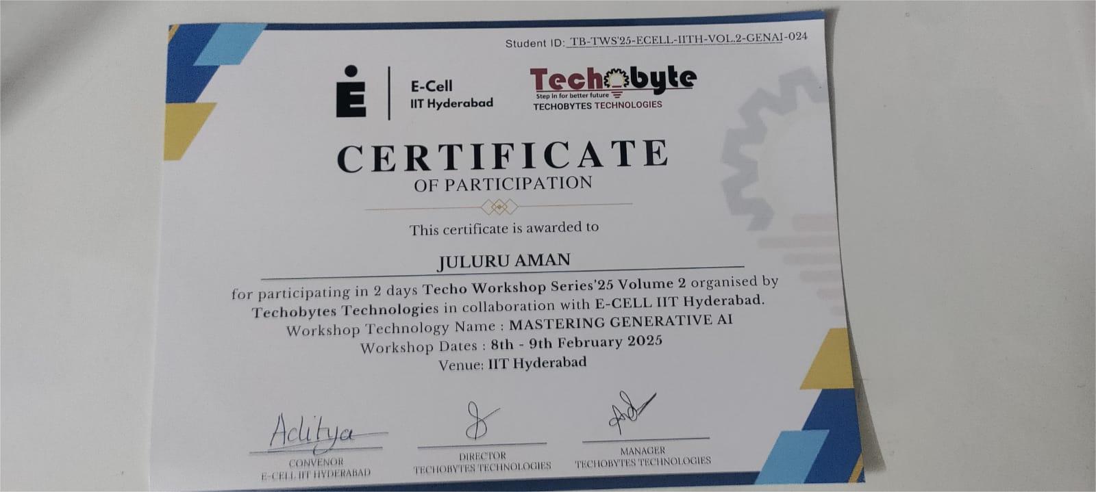 | Juluri Aman (247R1A05DN) | 2024-28 | Participated in 2 days Techno Workshop Series 25 Volume 2 organized by Technobytes Technology in association with E-CELL IIT Hyderabad. | View |