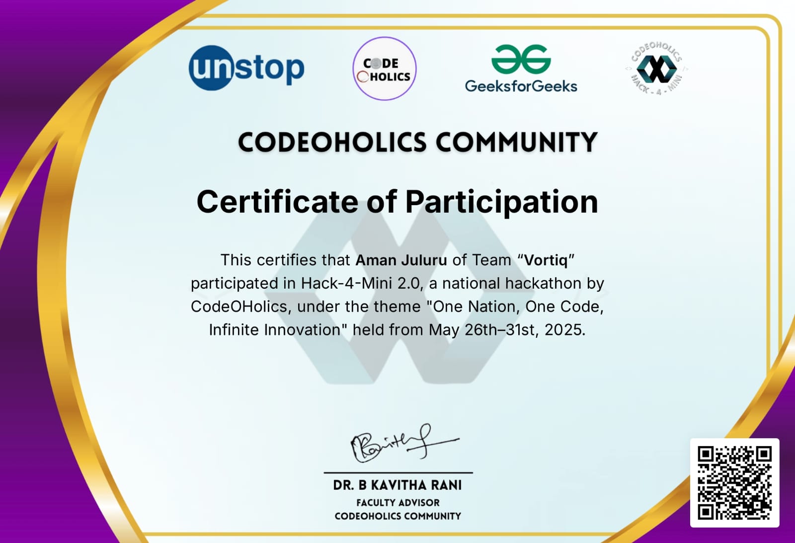 | Juluri Aman (247R1A05DN) | 2024-28 | Participated in Hack4Mini, Hackathon organized by Coloholics club, CMRTC | View |