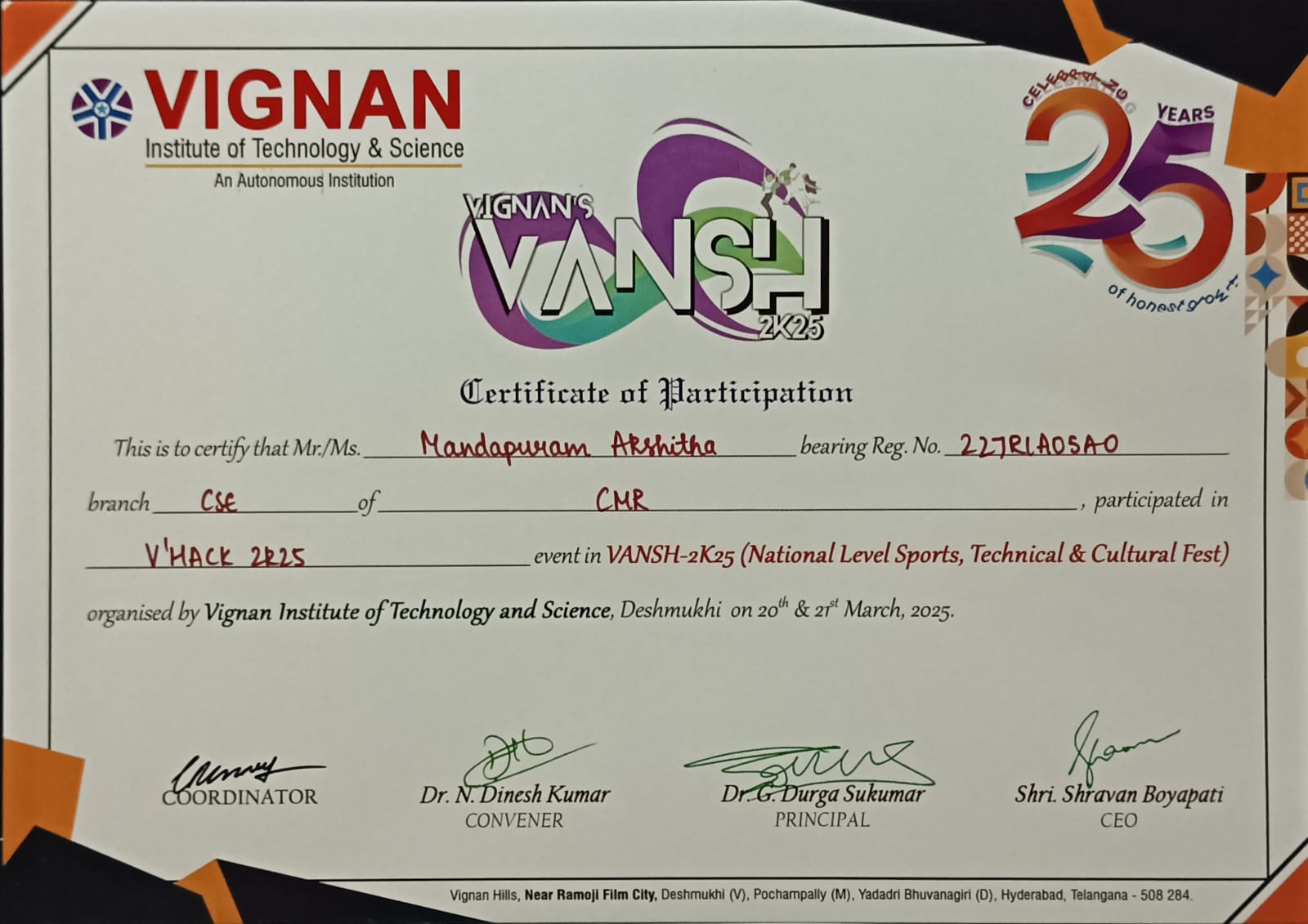 | M Akshitha (227R1A05A0) | 2022-26 | Participated in VANSH 2K25, National level sports and cultural festival organized by Vignan Institute of Technology and Science. | View |