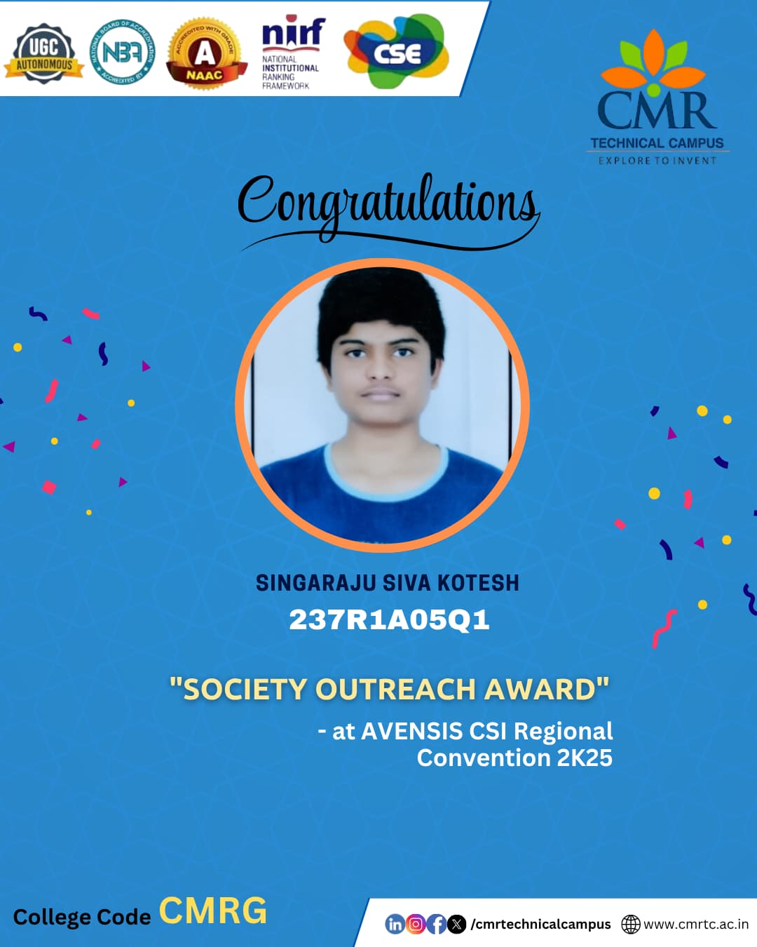 | 2022-23 | Mohammed Umer | 2020-24 | Top Performer towards Online e-Poster Contest “India’s Efforts for Fostering Innovation” In View of “Azadi Ka Amrith Mahotsav,15-08-2022” organized by ECE Dept, CMRTC |
