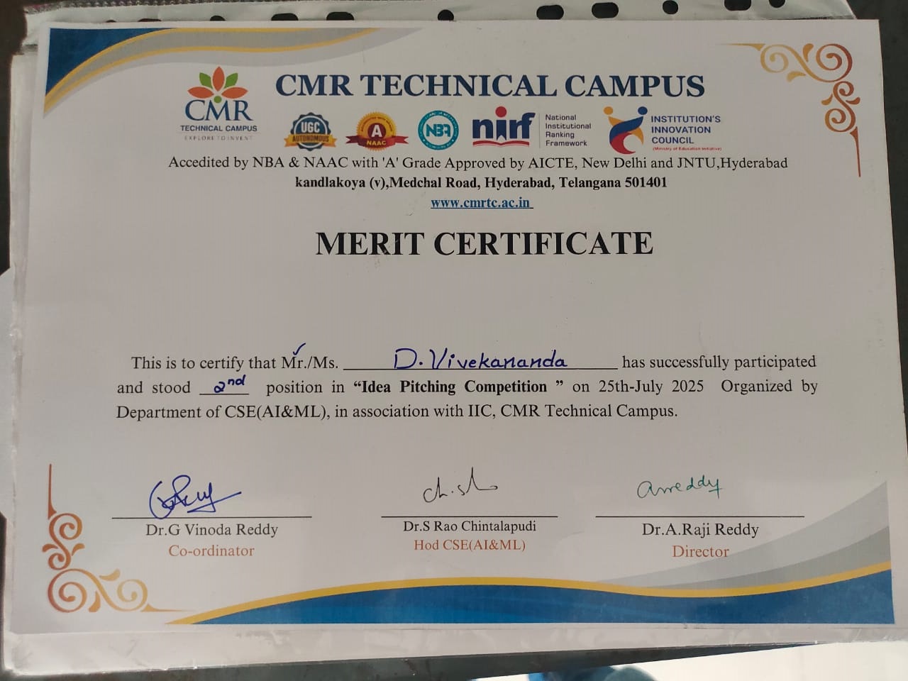 | D Vivekananda (247R1A0515) | 2024-28 | Stood 2nd Position in Idea Pitching competition organized by CMR Technical Campus | View |