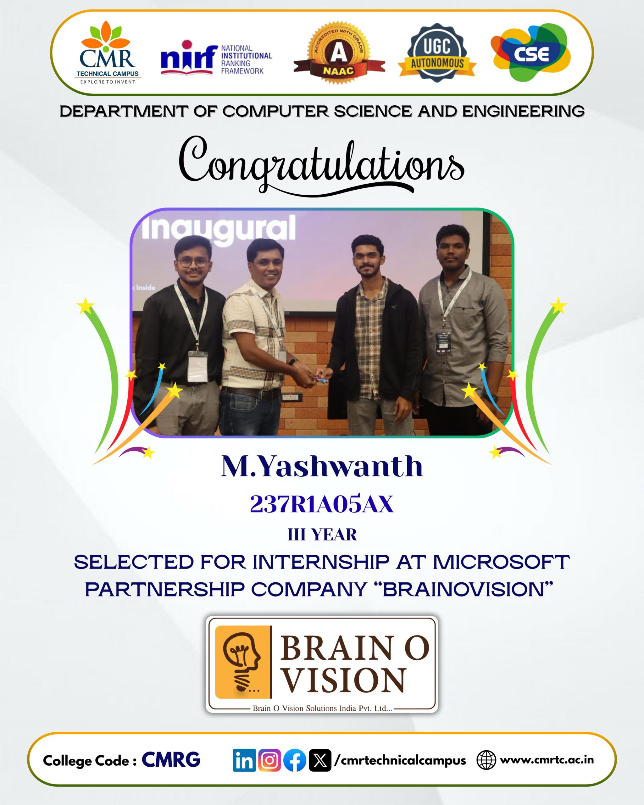 | M Yashwanth (237R1A05AX) | 2023-27 | Selected for Internship at Microsoft Partnered company Brainovision | View |