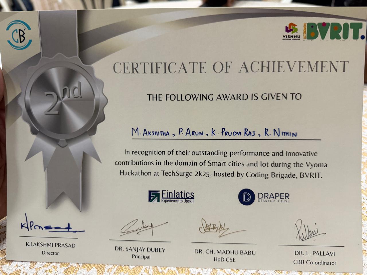 | M Akshitha, P Arun, K Pruthvi Raj, R Nithin | 2022-26 | Stood 2nd Position in Vyoma Hackathon organized by BVRIT Hyderabad | View |