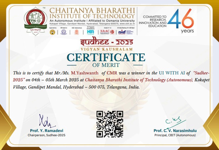 | M Yashwanth (237R1A05AX) | 2023-27 | Stood First in UI with AI of Sudhee-2025 organized by CBIT, Hyderabad | View |